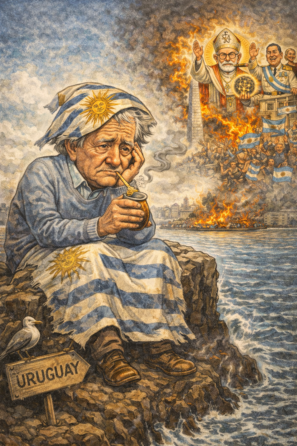 Desde cierta distancia, el espectáculo tiene algo de tragicomedia divertida. Sobre todo, para una pequeña y gris provincia amputada que alguna vez formó parte del mismo cuerpo histórico. Allí, al otro lado del estuario, sobrevive el “Río de los Pájaros Pintados”, es decir, Uruguay. Esa república silenciosa, melancólica y no del todo convencida de su propia supervivencia debido a sus inclinaciones suicidas, observa a la Argentina con una mezcla peculiar de ironía y afecto. Uruguay mira a su hermano mayor como quien contempla a un genio atrapado en un sueño febril: un país exuberante, brillante y agotador donde Freud continúa interpretando los sueños colectivos en clave cabalística mientras Perón, desde un balcón eterno, sigue hablando a una multitud que jamás termina de equilibrarse.