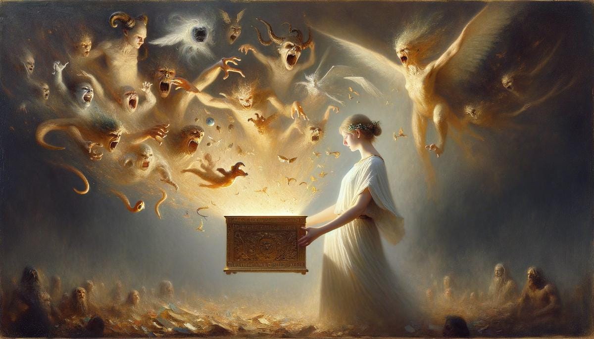 No es casualidad que este mito resuene en otras culturas, damas y caballeros. En la Grecia antigua, Pandora—la “primera mujer”, moldeada por los dioses para castigar a los hombres— recibe una jarra sellada y, movida por esa misma curiosidad insaciable, la abre. De ella salen todos los males: enfermedades, guerras, envidias, vejez. Solo queda la esperanza, encerrada como ironía final. Eva y Pandora son dos caras de la misma moneda mítica: la mujer como catalizadora de la decadencia antropológica.