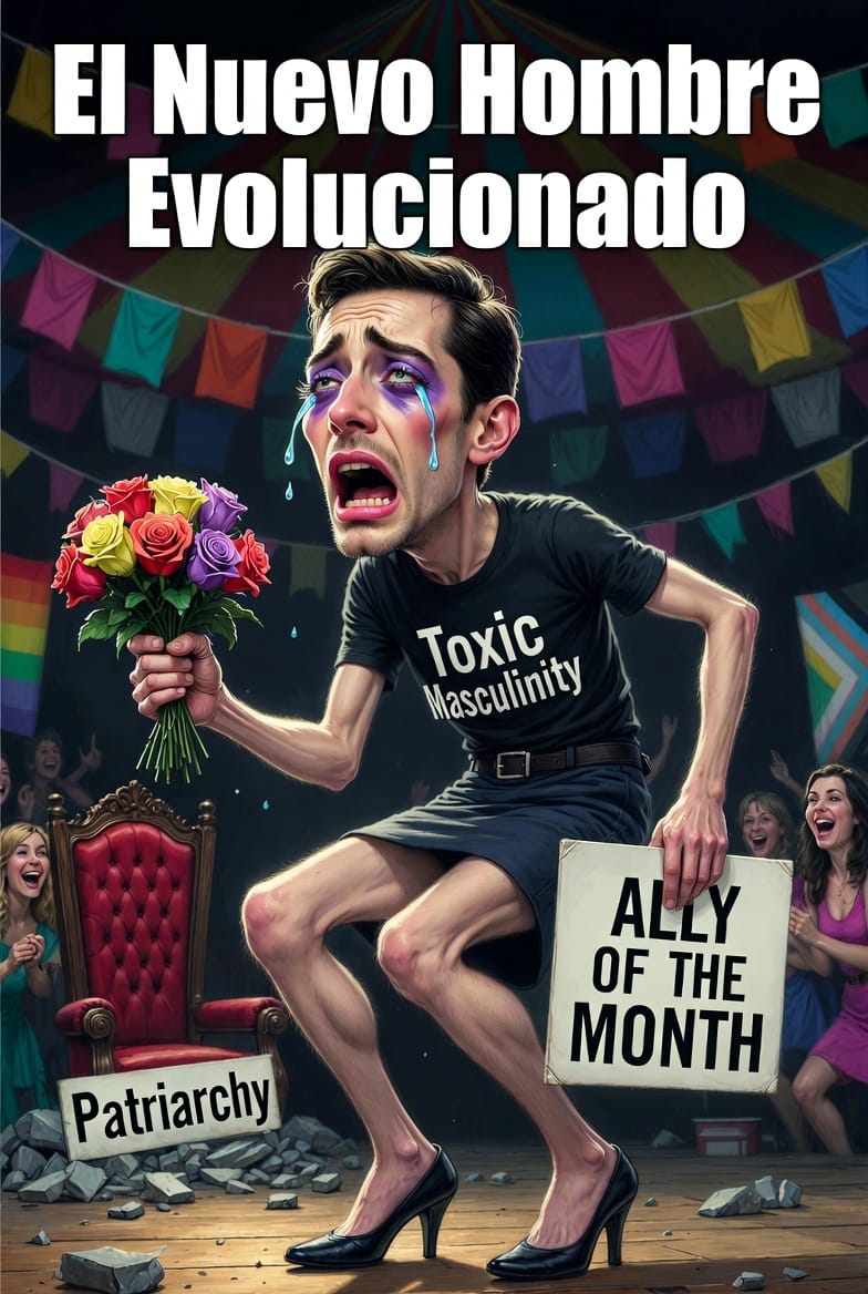 El hombre, en cambio, no es vector de ataque alguno. No lo es porque, en la selección sexual de la especie, el varón no lidera: persigue, compite y se adapta a los dictados femeninos para reproducirse. Es la mujer quien elige, quien impone los estándares evolutivos y culturales; el macho solo sigue el rastro hormonal y social que ella marca. Y ahora, con su masculinidad payasesca deconstruida y maquillada de rosas -convertida en un bufón con tacones, barba de tres días y lágrimas de sensibilidad de libros de Rolón-, el hombre ha sido neutralizado por completo. Ya no es el guardián del orden ni el constructor de imperios: es un accesorio ridículo en el circo woke, un metrosexual llorón que pide permiso para existir, un payaso con labios pintados que celebra su propia castración simbólica como “evolución”. Neutralizado, domesticado y ridiculizado, el varón ya no amenaza el relato; solo lo adorna con flores de plástico.