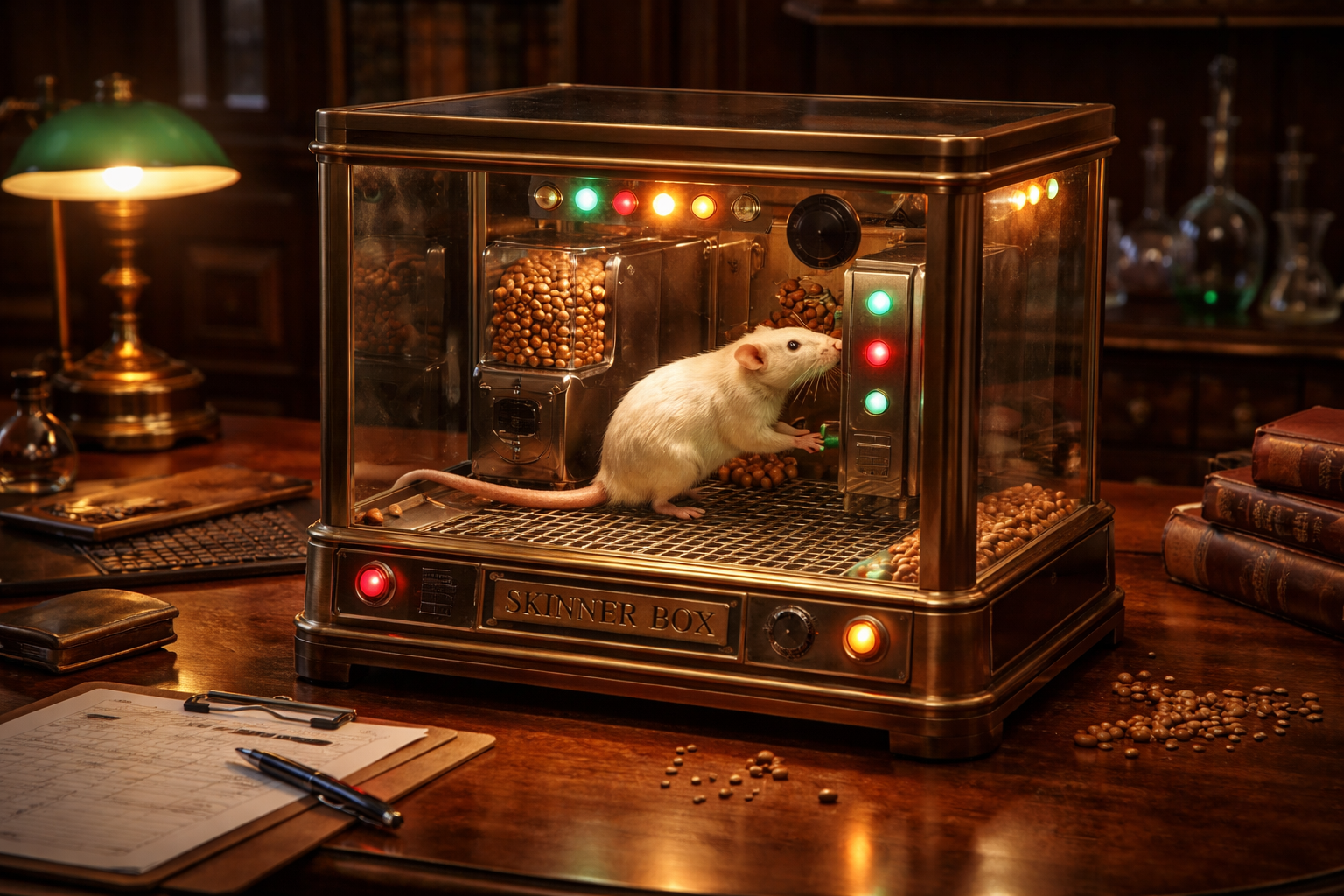 Antes de entrar en la arquitectura de este zoológico moral, conviene detenerse en su dispositivo central: la caja de Skinner. El conductismo radical de Skinner en USA no necesitó de grandes metáforas; bastaba una caja, una palanca y una rata. El animal, al accionar la palanca, recibía comida. Refuerzo positivo: una consecuencia agradable que aumenta la probabilidad de repetir la conducta. Pero el refinamiento llega cuando la recompensa se vuelve intermitente. No siempre hay comida. A veces sí, a veces no. Y entonces la conducta se intensifica. La rata insiste, prueba, persevera. Se instala en ella una tensión expectante, una especie de fe conductual. También existe el refuerzo negativo: la eliminación de un estímulo desagradable para fortalecer una conducta. Presionar la palanca puede hacer cesar una descarga eléctrica leve; la conducta se fija por alivio. El castigo, en cambio, introduce una consecuencia aversiva para reducir una conducta, aunque suele ser menos eficaz a largo plazo. Todo esto no es teoría abstracta: es ingeniería del comportamiento.