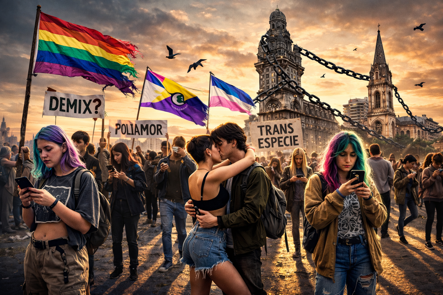 Pero el síntoma más visible no está solo en las cifras duras sino en la textura de los vínculos. Allí se observa la horrenda entropía sociológica de jóvenes generación Z y futuros Alpha. Adolescentes y veinteañeros que se autodefinen como demisexuales, poliamorosos, “ecolovers” o trans especie. La identidad se fragmenta en microetiquetas que prometen singularidad en un mercado saturado de singularidades rotas dentro de una probeta social. Ser transexual —que hace dos décadas era disruptivo— empieza a parecer casi conservador frente a la proliferación de identidades líquidas. Mucha autoetiqueta; poca estabilidad afectiva y mucha psicopatología. Mucho discurso; poca sustancia.