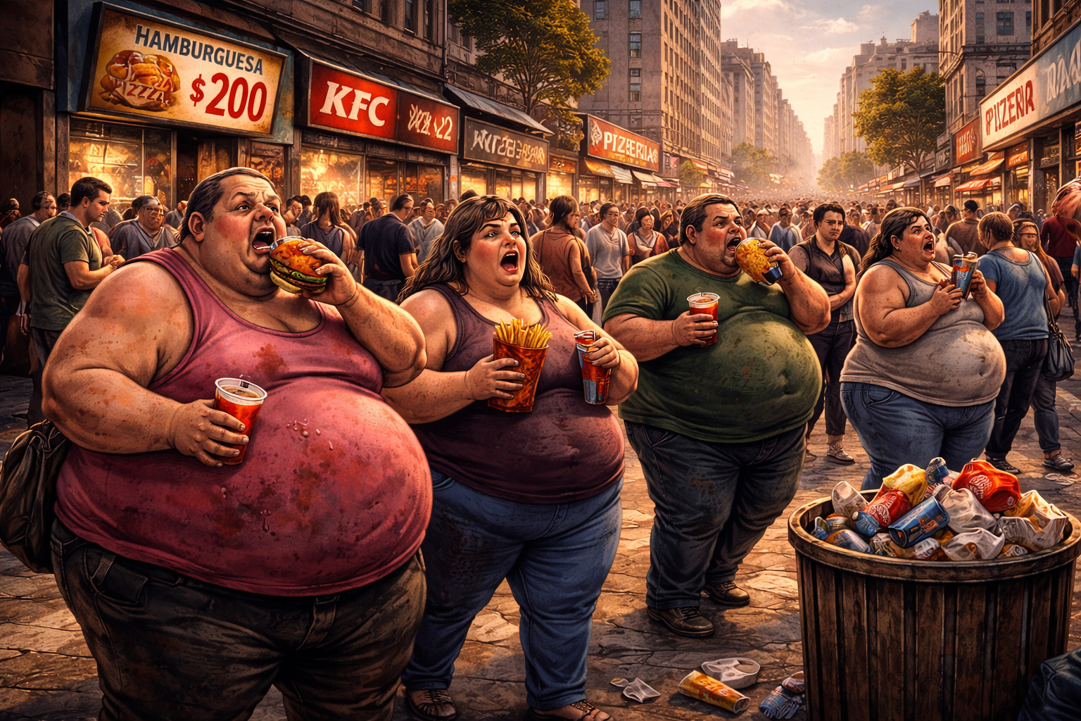 La salud física acompaña el cuadro: más del 60–65 % de los adultos con sobrepeso u obesidad. Enfermedades cardiovasculares y cáncer entre las principales causas de muerte. Libertad amplia en las leyes y discursos de las plazas; autodisciplina escasa y poco acceso a la calidad alimentaria.